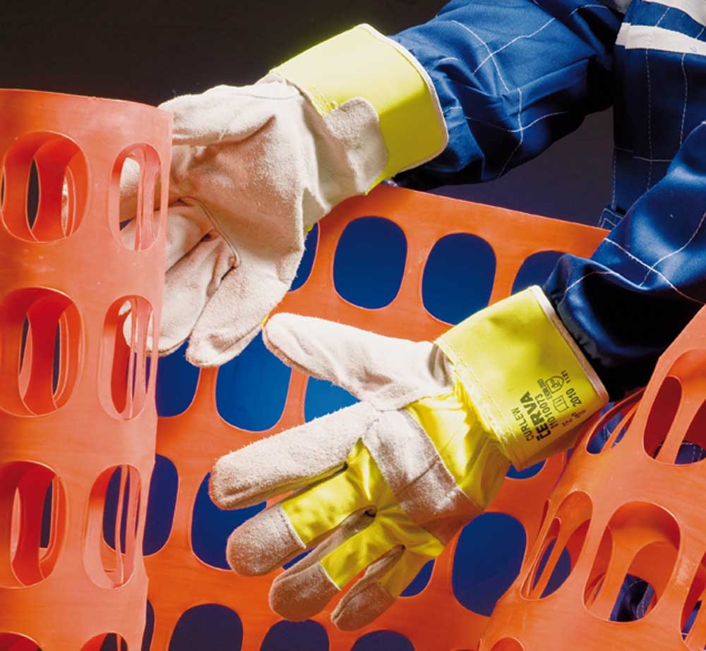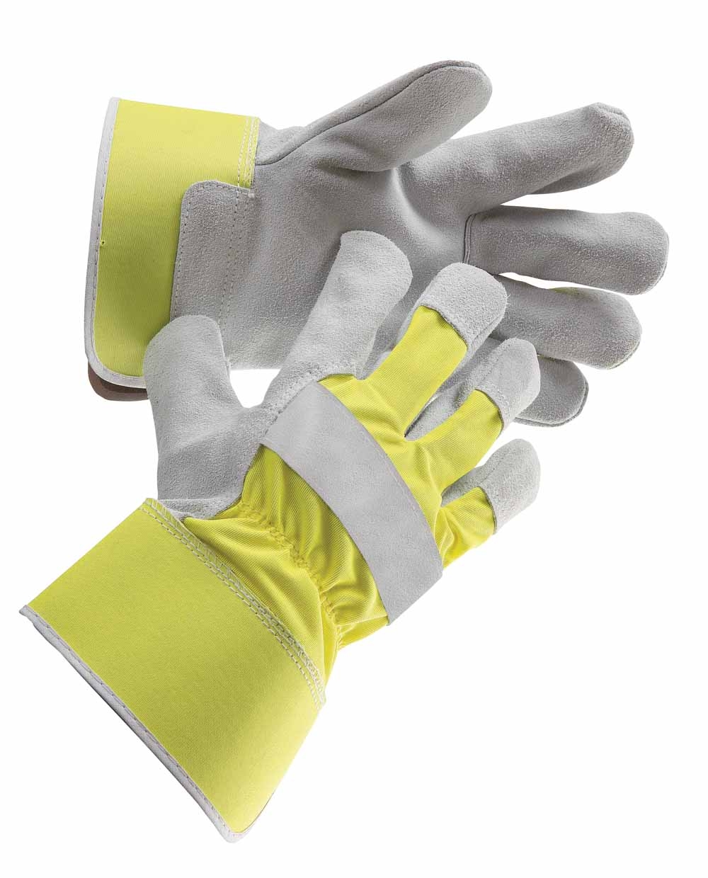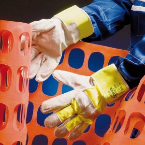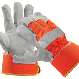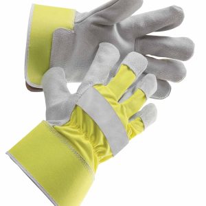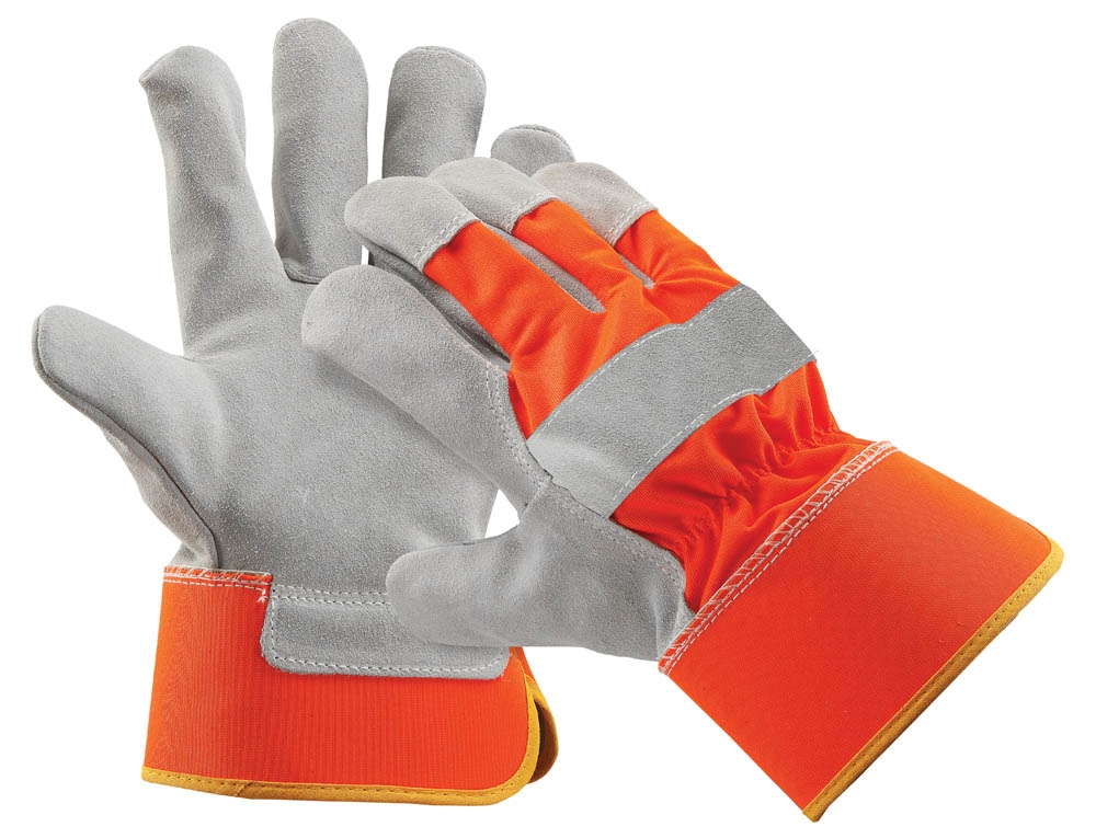 Manusi cu spalt de bovina monocolor pe toata palma si varfuri degete, tesatura din poliester pe dos palma, in culori stridente, captuseala poliester, manseta rigida.