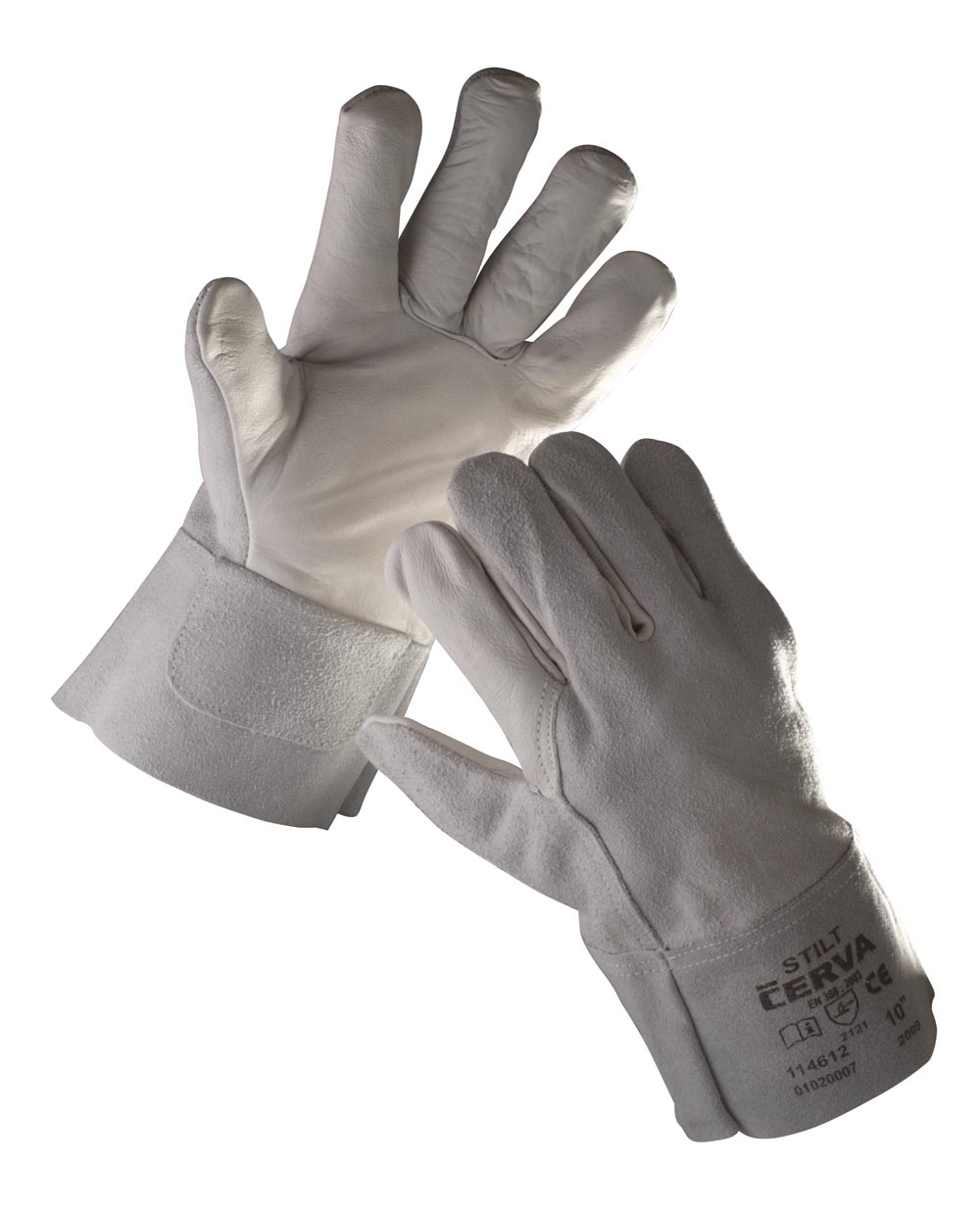 Manusi din piele alba de bovina , necaptusite , dosul palmei din spalt de bovina gri, manseta lata de 7 cm. marime 10